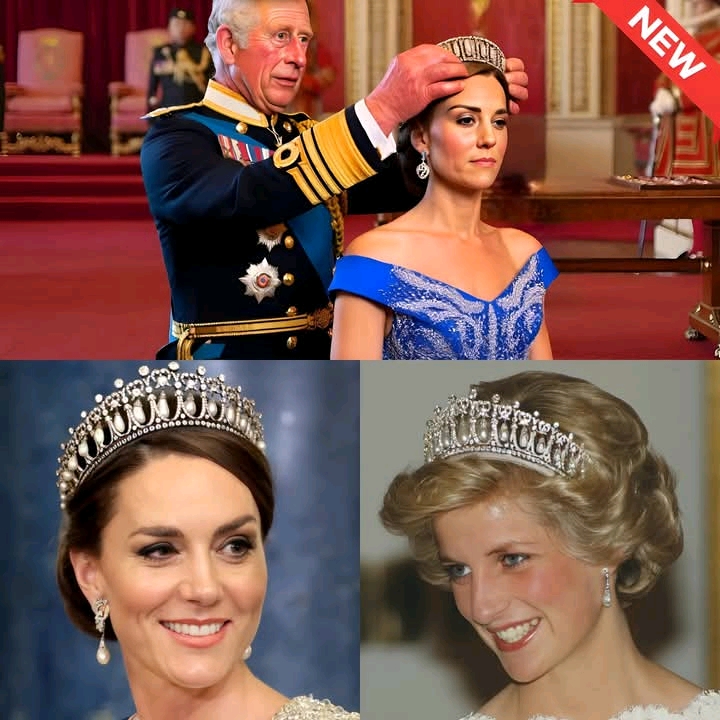 The chandeliers glowed like frozen constellations above Windsor Castle’s grand banquet hall. Dozens of cameras captured the glimmer of silver, the sound of violins, and the rustle of royal silk. But all attention turned to one figure — Princess Catherine, radiant in white satin, stepping through the arched doors wearing Princess Diana’s iconic “Lover’s Knot Tiara.”