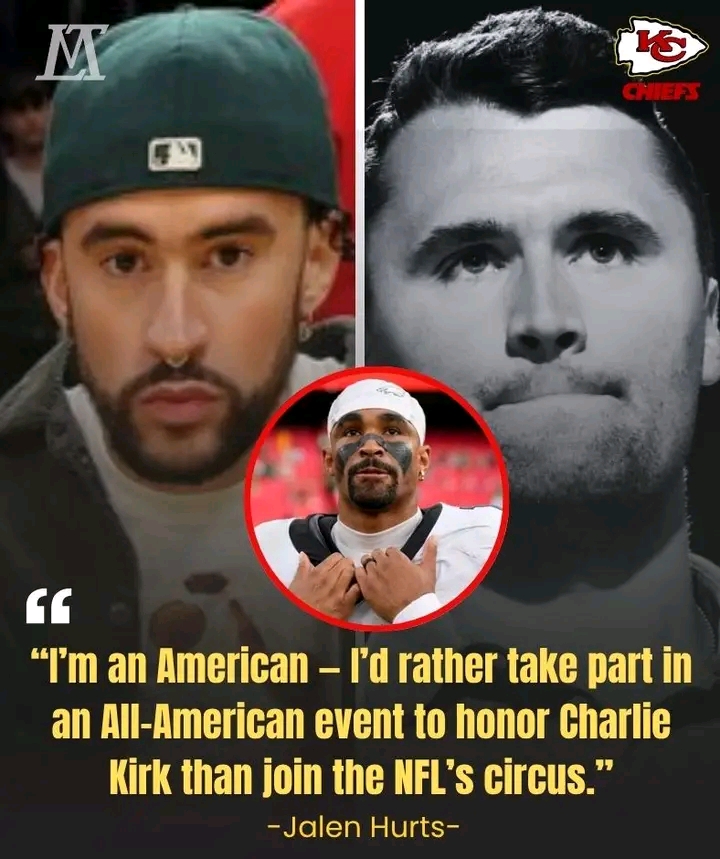 “BREAKING: Jalen Hurts caused a stir after declaring he would boycott the Super Bowl if organizers still let Bad Bunny perform at the halftime show. He said he would instead join Turning Point USA to honor Charlie Kirk, adding a pointed remark: “I’m an American — I’d rather be part of something All-American than the NFL’s circus.” His statement has sparked a wave of controversy, with fans flooding social media with mixed reactions.” Full details: .