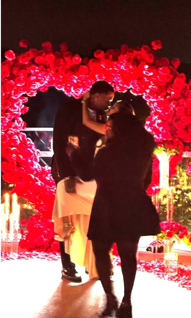 The Chiefs right tackle, 27, popped the question in front of an elaborate red backdrop featuring two spiraling balloon towers and a large, heart-shaped floral arrangement with a neon sign that read, “Will you marry me?” The pair were also surrounded by candles, rose bouquets, flower petals and photos of themselves during the special moment.