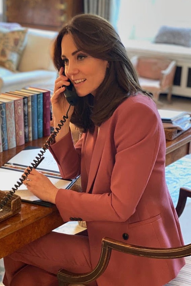 The Princess of Wales is pictured in 2020 in her stylishly decorated office in Kensington Palace – complete with piles of classic books in the background