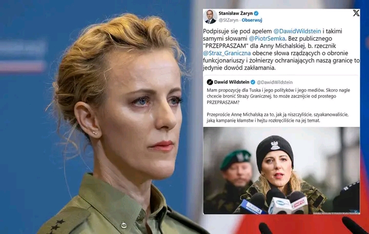 W mediach społecznościowych pojawiła się sugestia, wyrażona przez Dawida Wildsteina i Stanisława Żaryna, by rząd Donalda Tuska jak i sam premier przeprosili Annę Michalską, byłą rzecznik prasową Straży Granicznej za „kampanię kłamstw i hejstu” pod jej adresem. „Za to, że ją zwolniliście. Za te obrzydliwe ataki waszych hejterów z Silnych Razem. Za wszystko, co musiała przez was przeżyć” – napisał na X Dawid Wildstein. „Bez publicznego ‘PRZEPRASZAM’ dla Anny Michalskiej, b. rzecznik Straży Granicznej obecne słowa rządzących o obronie funkcjonariuszy i żołnierzy ochraniających naszą granicę to jedynie dowód zakłamania” – wtórował mu doradca prezydenta RP Stanisław Żaryn.