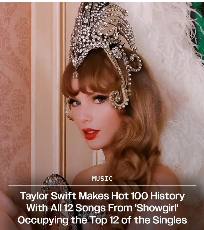 #TaylorSwift makes Hot 100 history with all 12 songs from #LifeofaShowgirl occupying the top 12 spots on the singles chart. This marks the first time any album has had every one of its songs take over the chart’s top spots without interruption in the history of the Hot 100, going back to the 1950s.